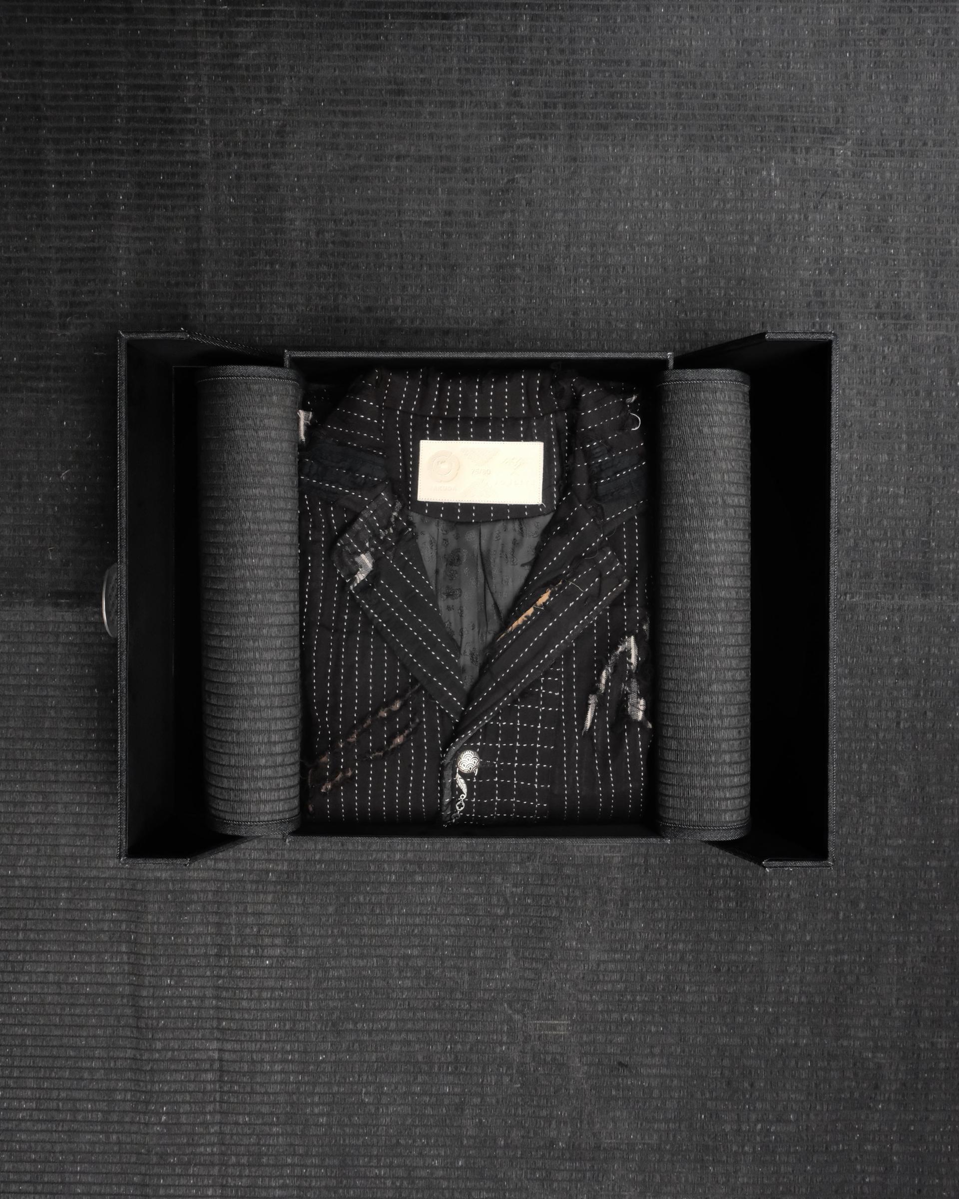 包裝盒採用黑丹寧與黑絨面包裹,內附黑染手編竹蓆。從觸摸包裝到穿上衣服,這是一場完整的感體驗。